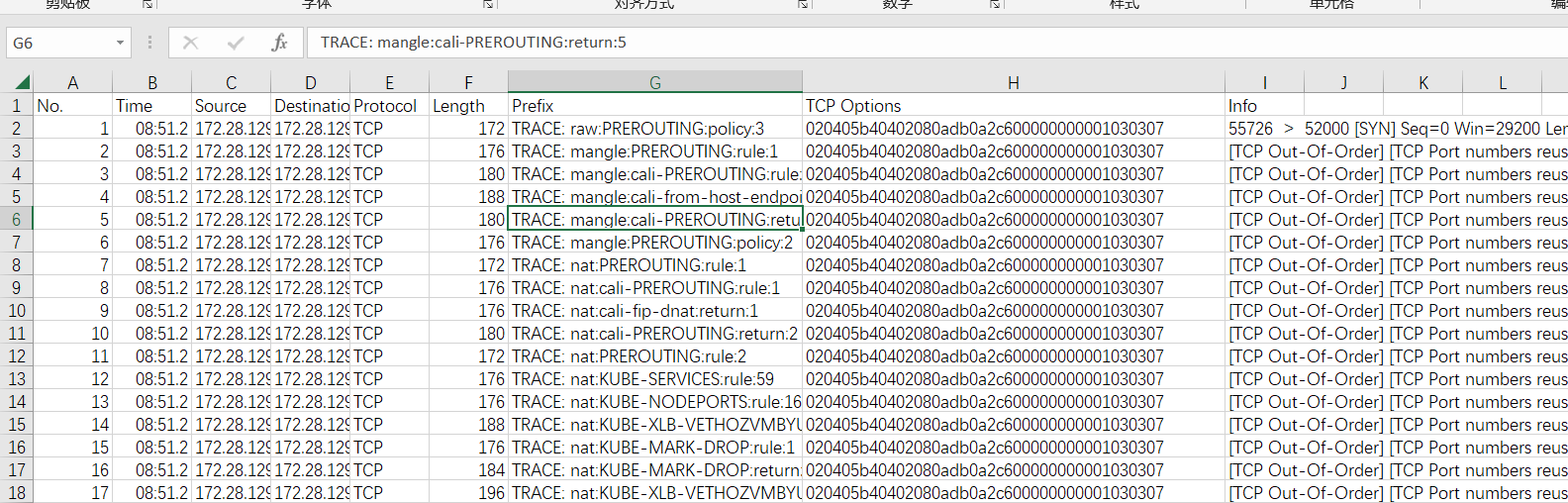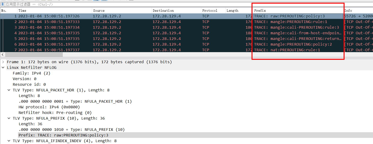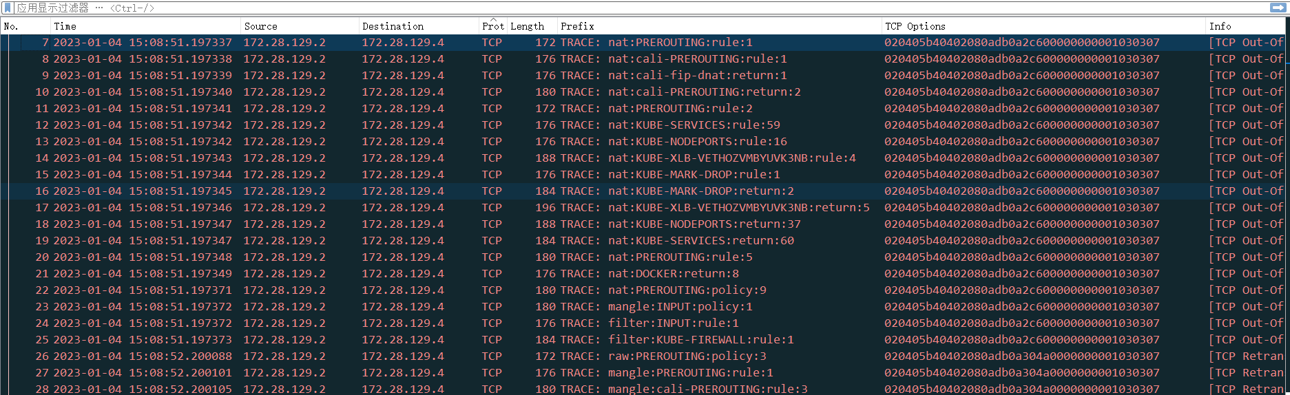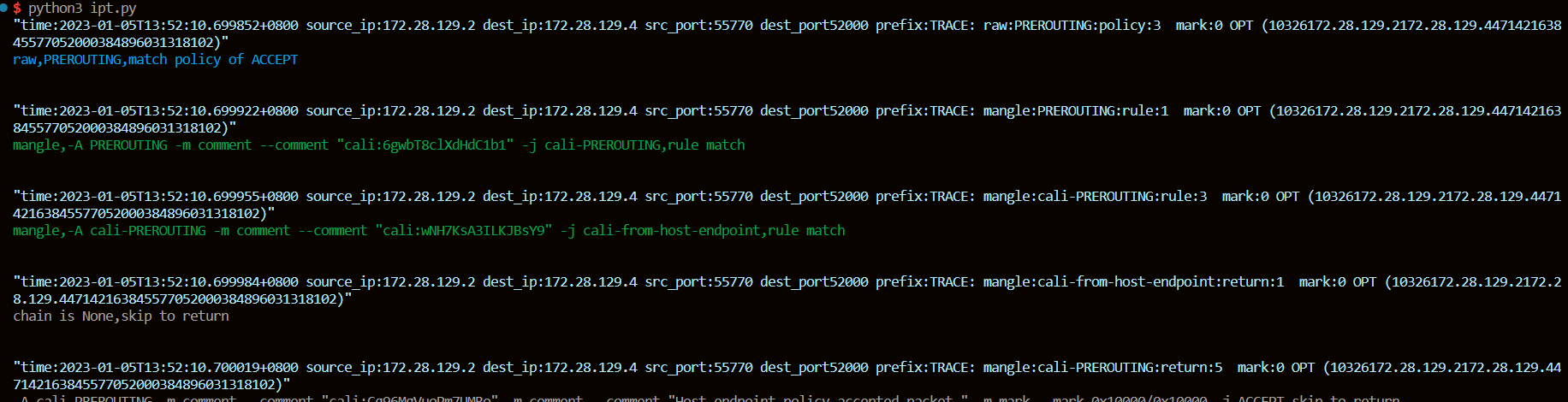 "time:2023-01-05T11:04:26.620963+0800 source_ip:172.28.129.2 dest_ip:172.28.129.4 src_port:55768 dest_port52000 prefix:TRACE: mangle:cali-PREROUTING:rule:3 mark:0 OPT (38576172.28.129.2172.28.129.41889216384557685200065878990447472)"