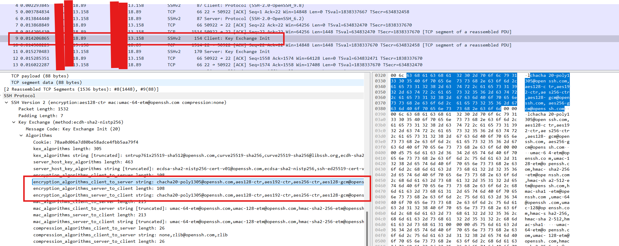 服务端发送Key Exchange inti,声明支持的加密算法为:aes128-ctr,aes192-ctr,aes256-ctr,arcfour256,arcfour128,[email protected],[email protected],aes128-cbc,3des-cbc,blowfish-cbc,cast128-cbc,aes192-cbc,aes256-cbc,arcfour,[email protected]