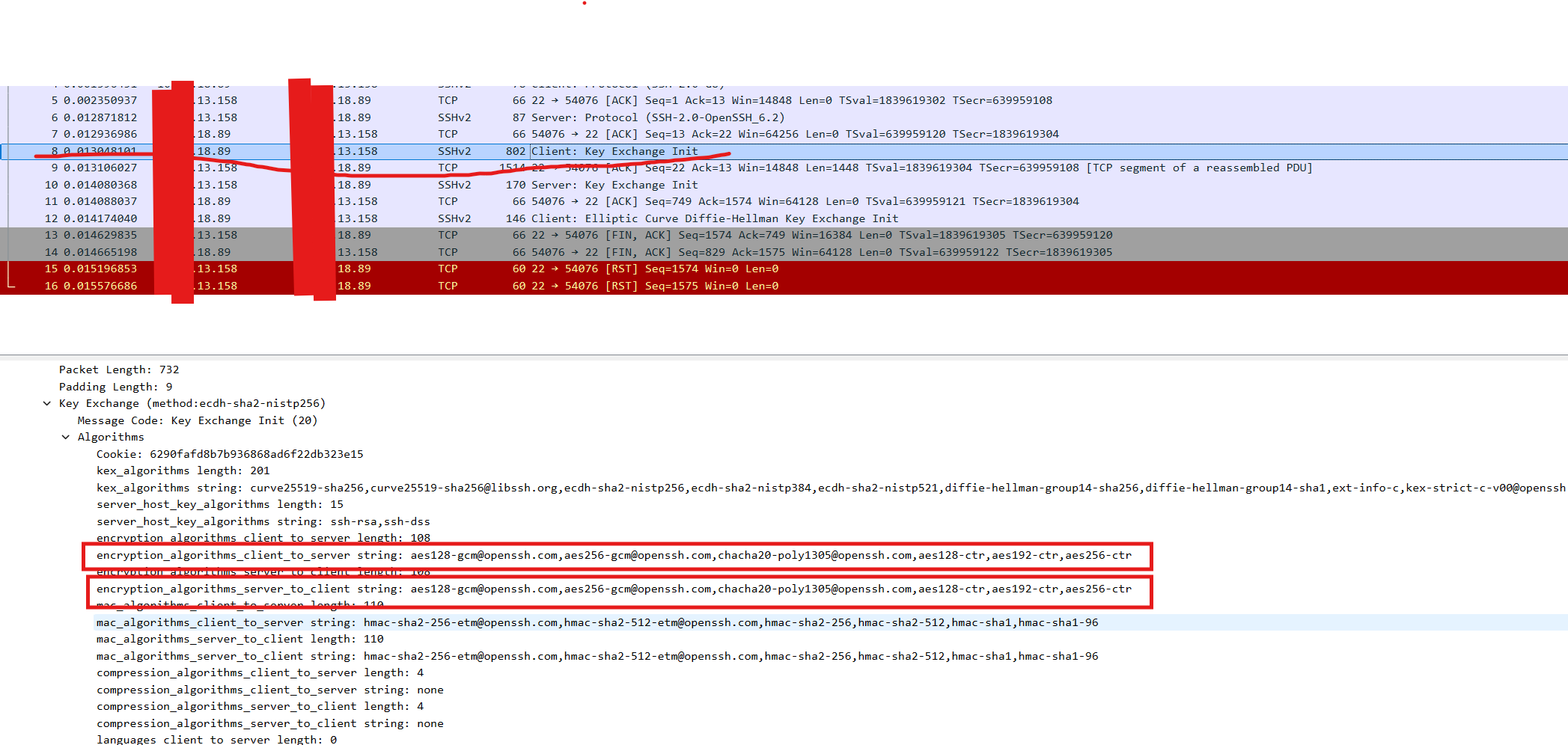 - 按照先后顺序进行匹配,ssh 服务端匹配到[email protected]作为加密算法。实际上,ssh服务端并不支持asegcm这种算法。因此key交换失败,主机返回一个reset。